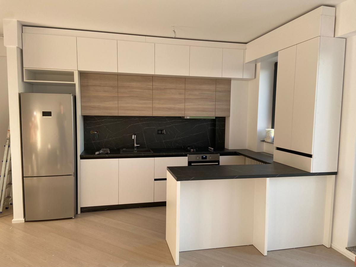 Mobila de bucatarie executata pe comanda, cu fronturi din MDF Lucios cu frezare maner, carcasa din PAL de 18mm grosime, Blat termorezistent 38mm grosime made in Italy, feronerie si accesorii de top marca BLUM.