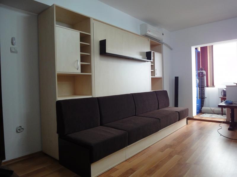 Acest ansamblu se compune din pat rabatabil pentru saltea 140x190cm , doua corpuri laterale si canapea pe lungimea intregului ansamblu care este de 300cm.Ansamblul este amplasat sub o grinda, motiv pentru care am adaptat proiectul spatiului disponibil.