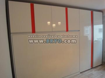 Pat rabatabil cu deschidere pe orizontala si corpuri laterale. Mobilierul este realizat din pal melaminat lucios.