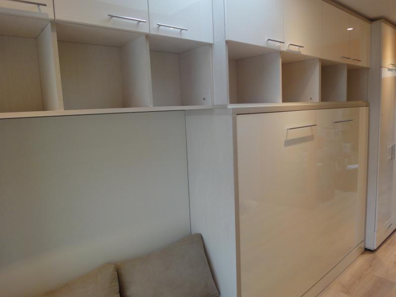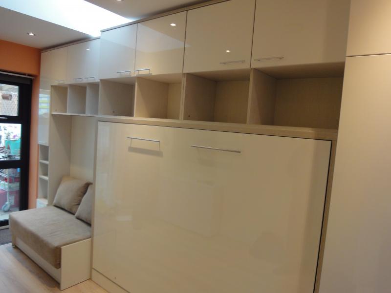 Ansamblu format din pat rabatabil cu deschidere pe orizontala, canapea si corpuri laterale. Acest mobilier a fost montat in Dublin ,Irlanda.